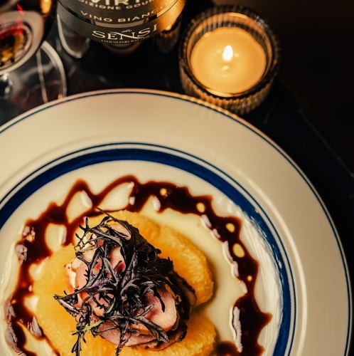 For authentic Italian cuisine in Sannomiya, come to our restaurant! Our "Duck Pastrami and Orange Carpaccio" is a chef's special and proud creation. The rich flavor of the duck meat is perfectly complemented by the fresh acidity of the orange, creating an exquisite taste. The vibrant presentation is also perfect for photos, adding a touch of glamour to girls' nights out and dates! Pair it with a rich red wine for an even more luxurious experience.