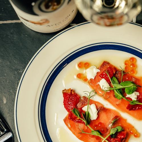 This carpaccio features fatty salmon generously topped with popping salmon roe. The melting texture and just the right amount of saltiness combine to fill your mouth with delicious flavor! It's also visually stunning, making it a perfect dish for girls' nights out, birthdays, or anniversaries!